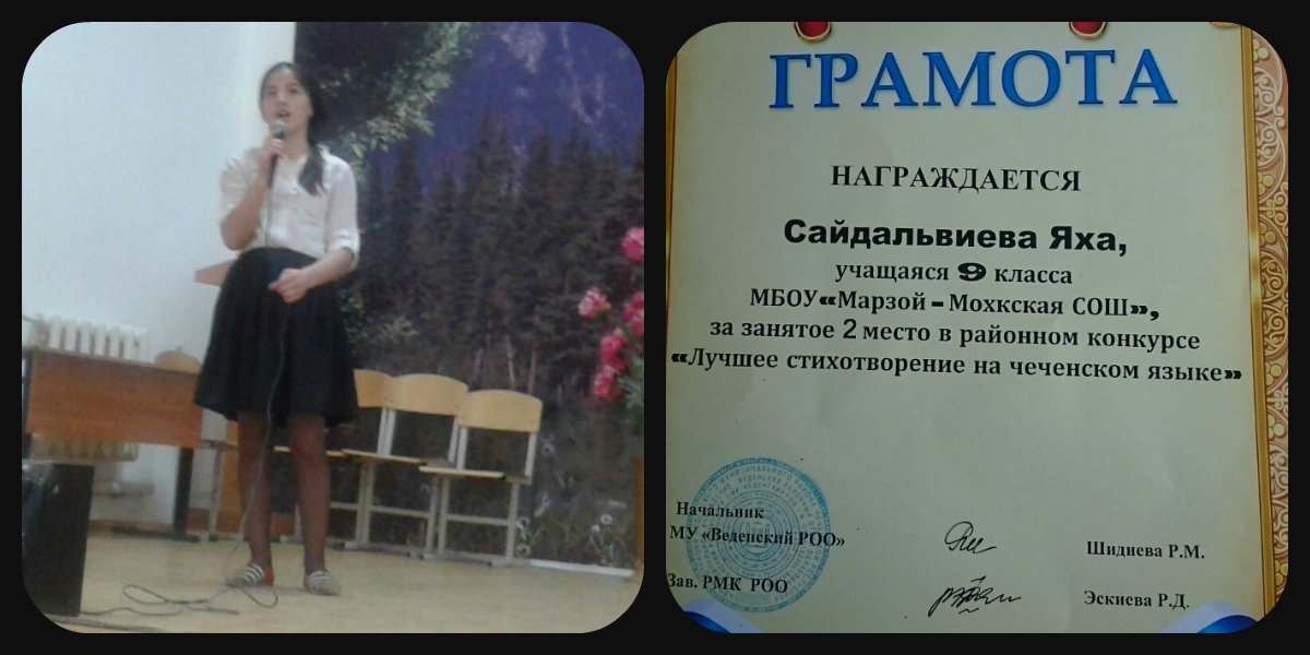 Обучающаяся 9 класса Сайдальвиева Яха заняла II место в районном этапе республиканского конкурса "Лучший чтец", посвященного ко Дню чеченского языка.